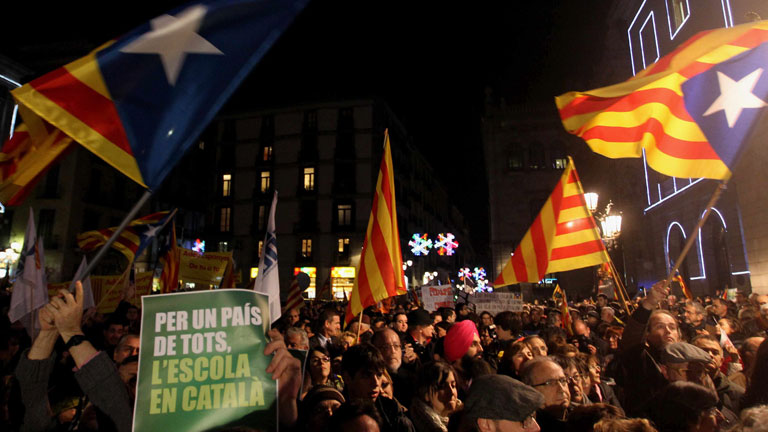 Unas 4.500 de personas se han concentrado la tarde de este lunes en la plaza Sant Jaume de Barcelona a favor de la escuela catalana y la inmersión...