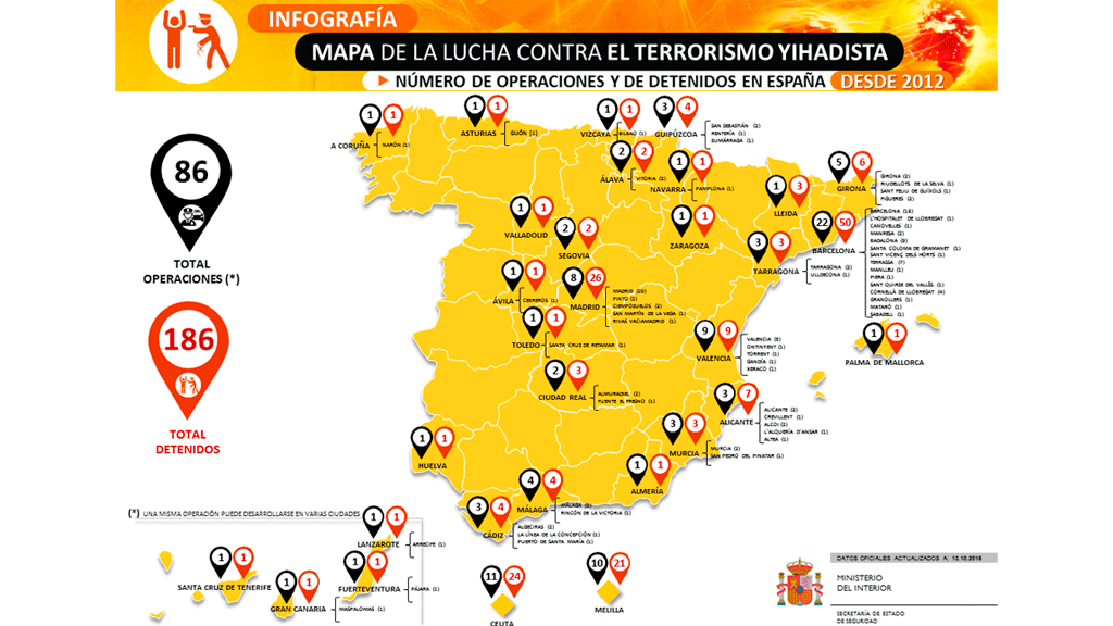 A partir de 2012, Cataluña ha sido la comunidad autónoma con más detenidos vinculados al yihadismo: un total de 77, si bien solo en la ciudad autónoma de Ceuta se han producido 55 detenciones