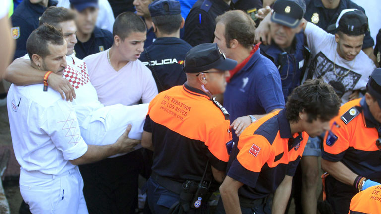 Dos corredores contusionados en el primer encierro en San Sebastián de los Reyes, la "Pamplona Chica". Dentro de la plaza, un toro de Juan Albarrán...