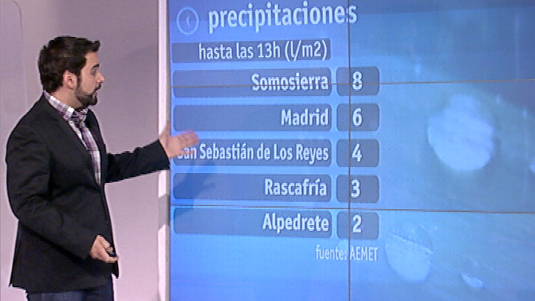 22/11/2011 00:00:35La previsión meteorológica de la Comunidad de Madrid para este martes indica que los cielos estarán muy nubosos con precipitaciones débiles localmente moderadas, de nieve por encima de unos 1.500 metros, según ha informado la Agencia Estatal de Meteorología (AEMET). En la primera mitad del día habrá nieblas en la sierra y probabilidad en forma de bancos en el resto. Los vientos del suroeste soplarán flojos girando a noreste por la tarde. Las temperaturas iniciarán un progresivo descenso que llegará a ser moderado al final del día, momento en el que se darán las mínimas de la jornada. Así, el termómetro oscilará en Madrid capital entre los 8 y 11 grados; en Buitrago entre los 6 y 7; en Getafe entre los 10 y 11; en Aranjuez entre los 10 y 12; y en Navacerrada entre los 0 y los 2.