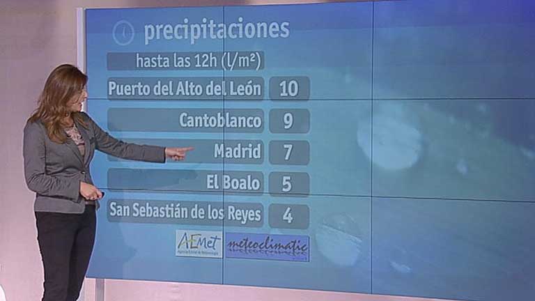 25/10/2012 00:00:59La previsión meteorológica en la Comunidad de Madrid para hoy, jueves, indica que los cielos estarán muy nubosos o cubiertos con precipitaciones débiles a moderadas y posibilidad de alguna tormenta sobre todo en la sierra, según ha informado la Agencia Estatal de Meteorología (AEMET). Además, habrá brumas y nieblas en zonas medias y altas de la sierra. Los vientos del sur soplarán flojos con intervalos de moderados y en zonas altas de la sierra serán moderados y ocasionalmente fuertes. Las temperaturas mínimas estarán en ligero a moderado descenso en zonas altas de la sierra, sin cambios en el resto de la región; las máximas descenderán moderadamente. Así, el termómetro oscilará en Madrid capital entre los 12 y los 15 grados; en Buitrago, entre los 7 y 13; en Getafe, entre los 12 y 15; en Aranjuez, entre los 12 y los 16; en el puerto de Navacerrada, entre los 4 y los 9; y en el puerto de Somosierra, entre los 5 y los 12 grados centígrados.