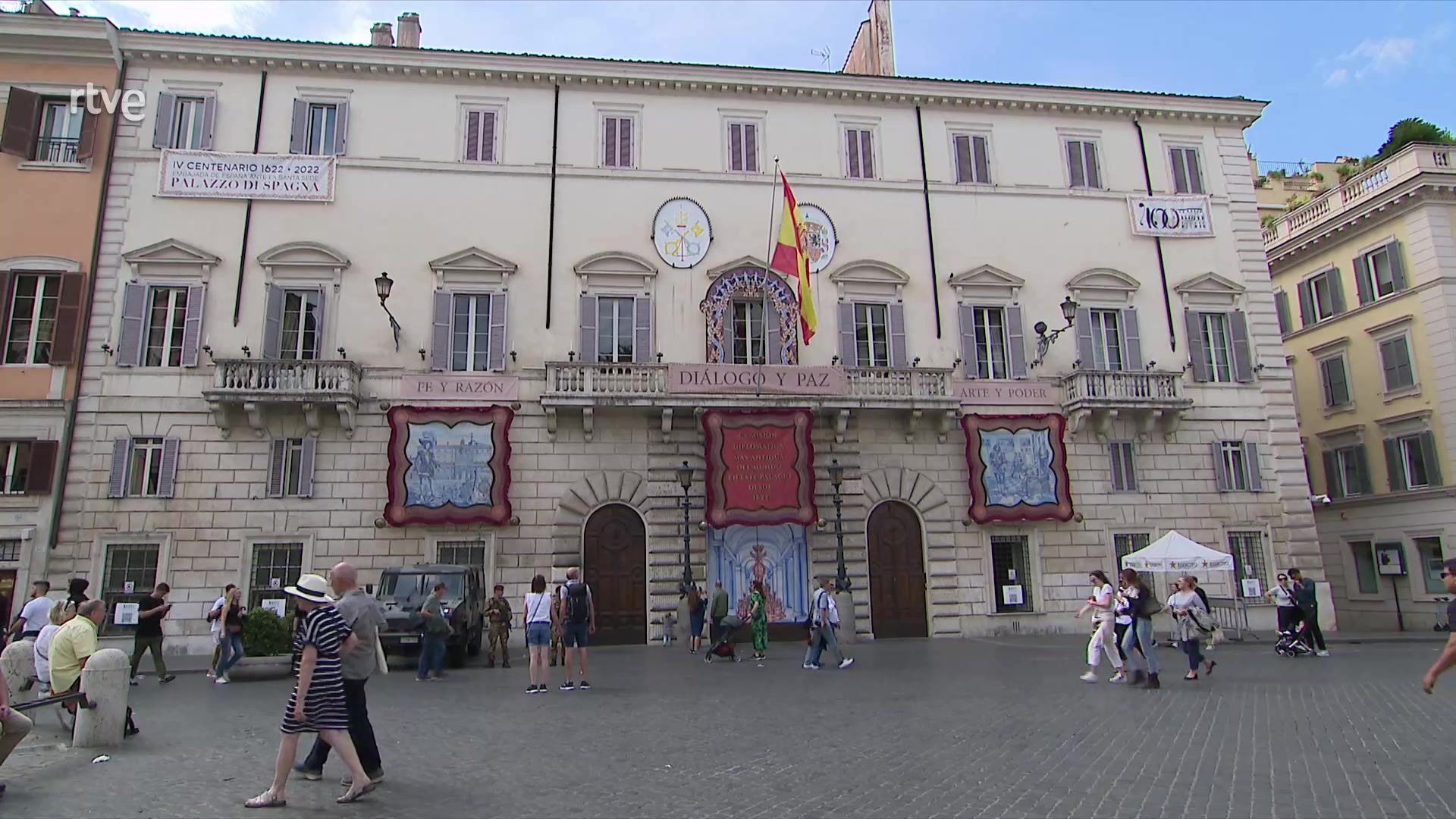 Informe Semanal entra en la legación diplomática más antigua del mundo. Es la de España ante la Santa Sede. Fue inaugurada en 1622 y, por tanto, este año, ha cumplido 400 años. Angela Rodicio y Miguel Ángel Guzmán nos muestran los tesoros del palacio que la alberga en Roma. Es un lugar repleto de Historia y de Arte.