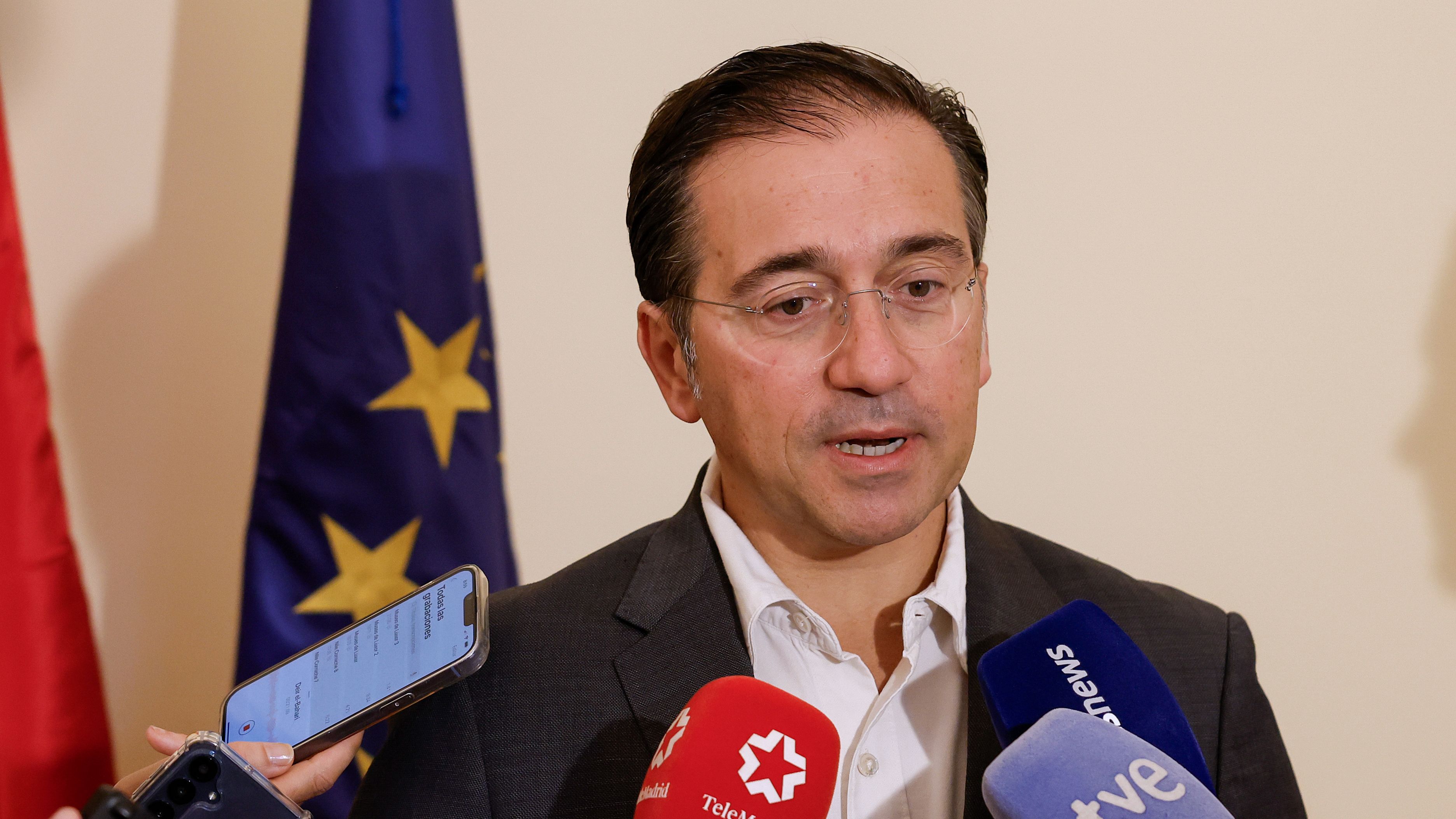 FOTO: El ministro de Asuntos Exteriores, José Manuel Albares, en declaraciones a los medios de comunicación. EFE/JuanJo Martín