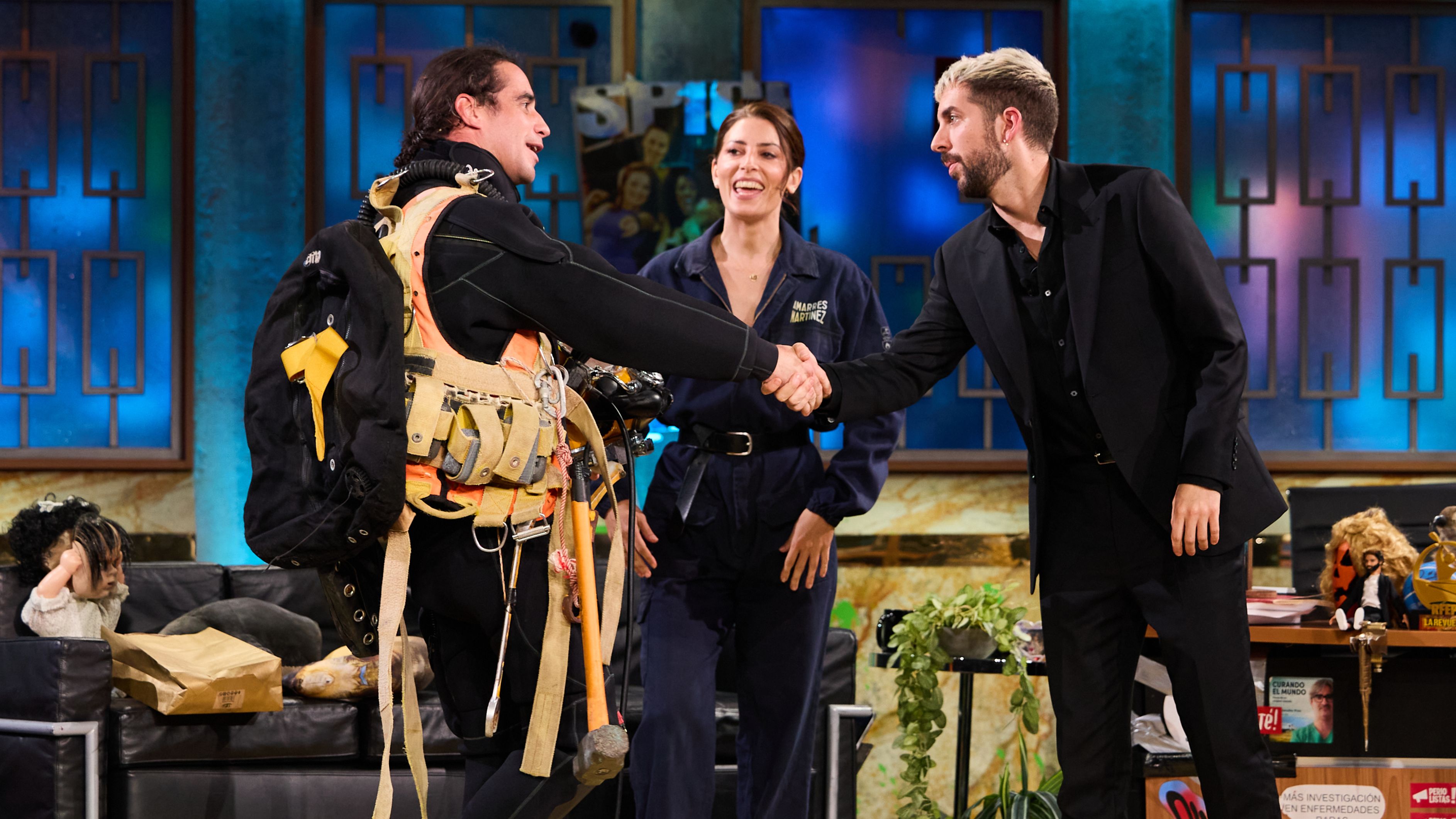 La actriz Bárbara Lennie presenta a David Broncano al buzo profesional Edu O’Kean, que ha ayudado a formar a los protagonistas de la película 'Los...