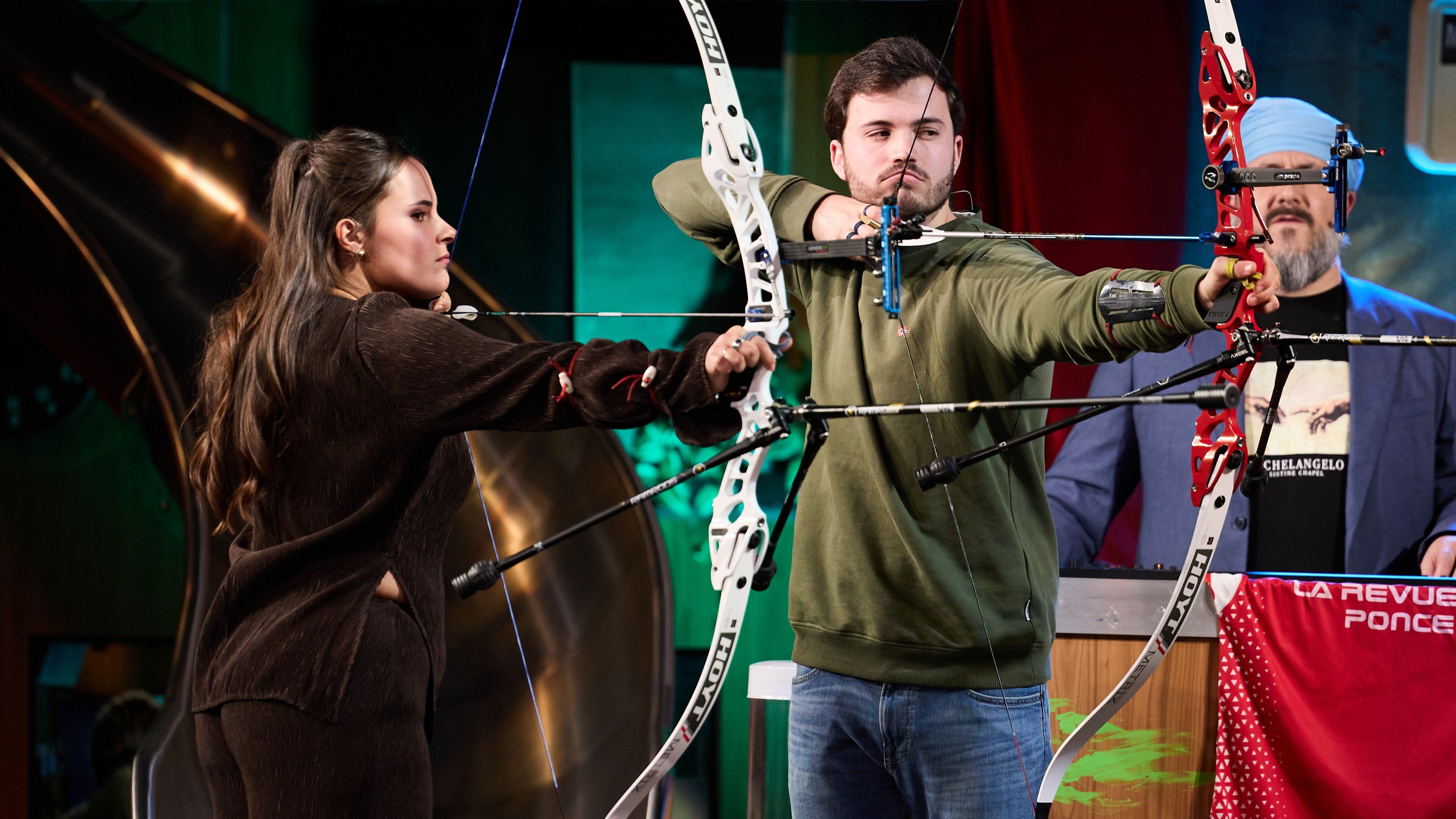 Los primeros españoles campeones del mundo de tiro con arco, Elia Canales y Andrés Temiño, demuestran su puntería sobre el escenario de La Revuelta