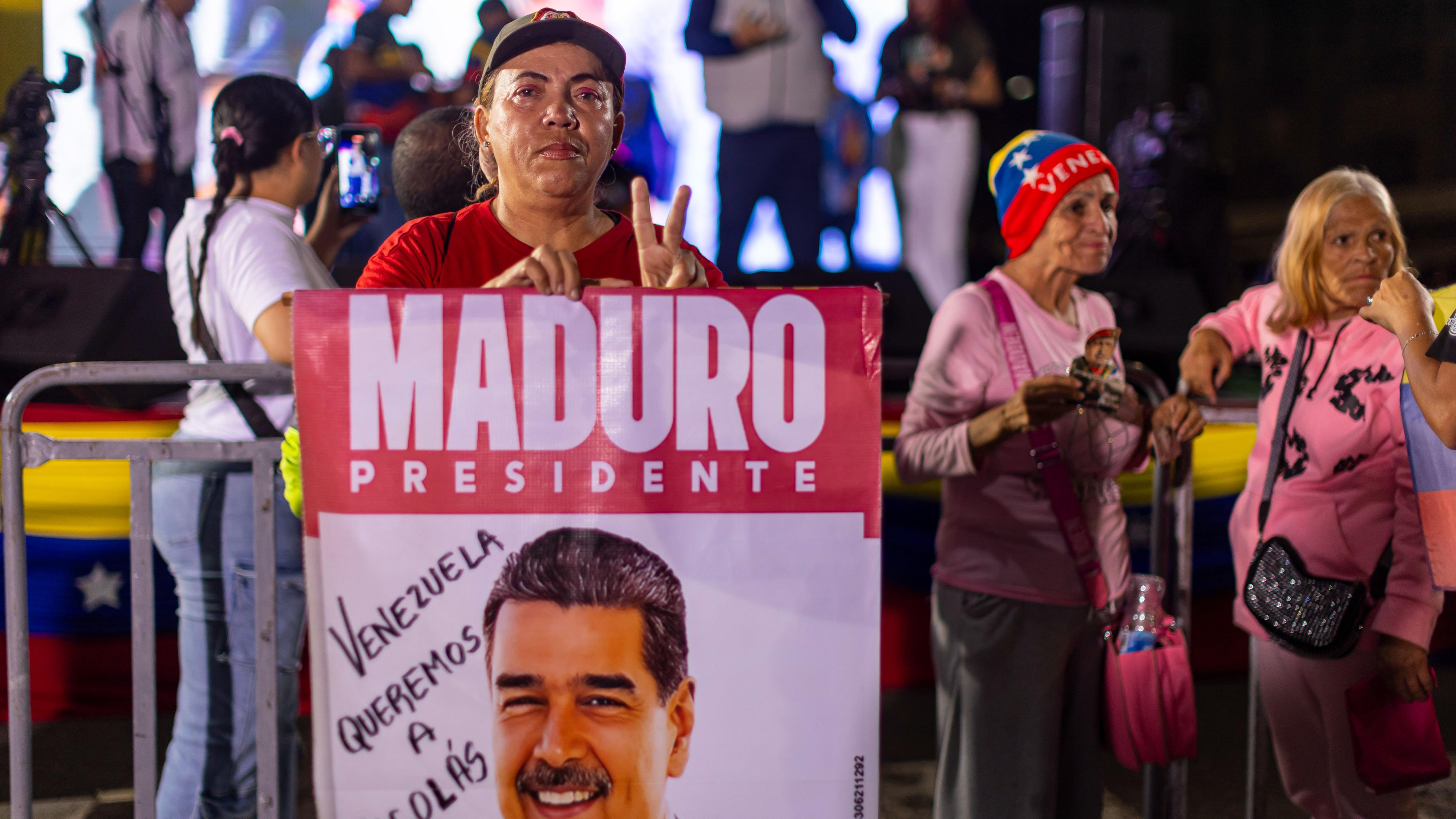 Una persona sostiene un cartel con la imagen del mandatario venezolano, Nicolás Maduro, durante en una vigilia este lunes, en Caracas (Venezuela)