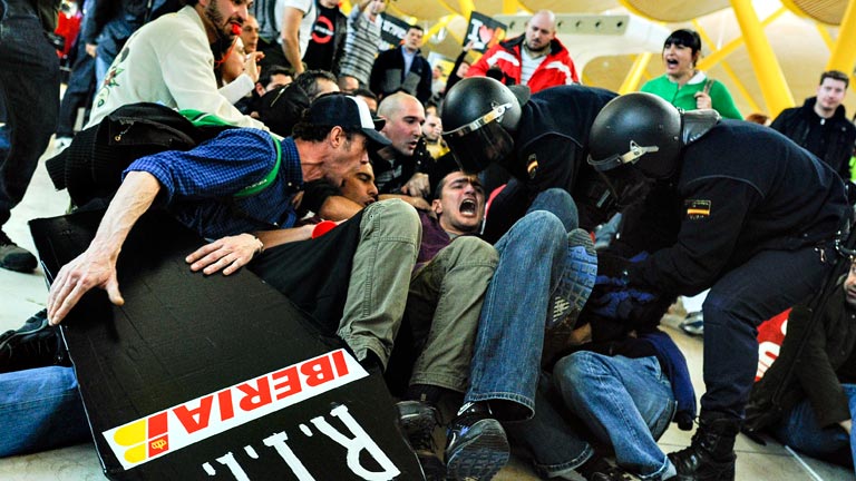 Coincidiendo con la primera jornada de paros los sindicatos de tierra y vuelo habían convocado a los trabajadores a concentrarse este mediodía en los aeropuertos. En la T4 de Barajas, finalmente, se concentraron 8.000 trabajadores, pero lo que iba a ser una manifestación en el exterior de la T4 se convirtió en una toma del interior, tras lograr "romper" el cordón policial, y durante tres horas hubo algunos enfrentamientos verbales y varios zarandeos con los más de 300 efectivos de la unidad de intervención policial desplegados, incidentes en los que ha resultado herida una persona y se han hecho cinco detenciones.