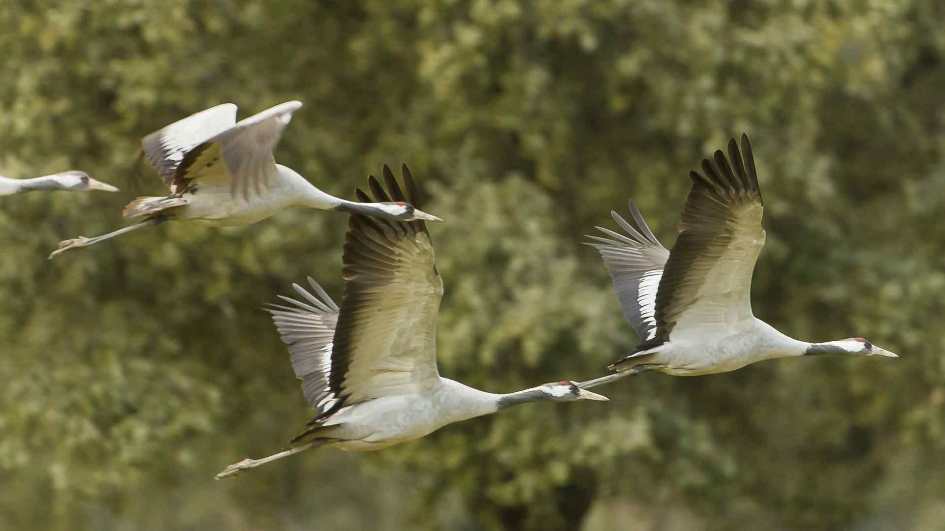 Cada amanecer y cada atardecer se convierten en un espectáculo natural sin parangón cuando las enormes bandadas abandonan o regresan a sus dormideros tras pasar el día alimentándose. Es un espacio de abundancia, pero también con amenazas en forma de depredadores, siempre en busca de una presa desprevenida. En ese entorno privilegiado convivirán hasta que los espectaculares bailes nupciales de las grullas anuncien la inminencia de la primavera y el viaje de regreso a sus distintos lugares de cría que deberán afrontar las aves del frío.