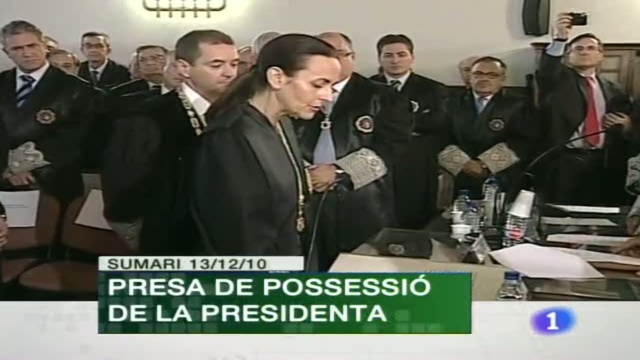 13/12/2010 00:25:33La nova presidenta del Tribunal Superior de Justicia de la Comunitat Valenciana, Pilar de la Oliva, ha pres possessió del seu càrrec este matí./Jorge Alarte ja és candidat socialista a la Presidència de la Generalitat, en un acte multitudinari que va comptar amb la presència d'Alfredo Pérez Rubalcaba./Ahir es van complir vint anys de la mort de Conxa Piquer./ Esports : l'Hércules va golejar el Màlaga, el Llevant va empatar a Gijón i el Vila-real va caure dissabte a Getafe mentre que, per a esta nit queda el partit del València, que rep l'Osasuna a Mestalla.
