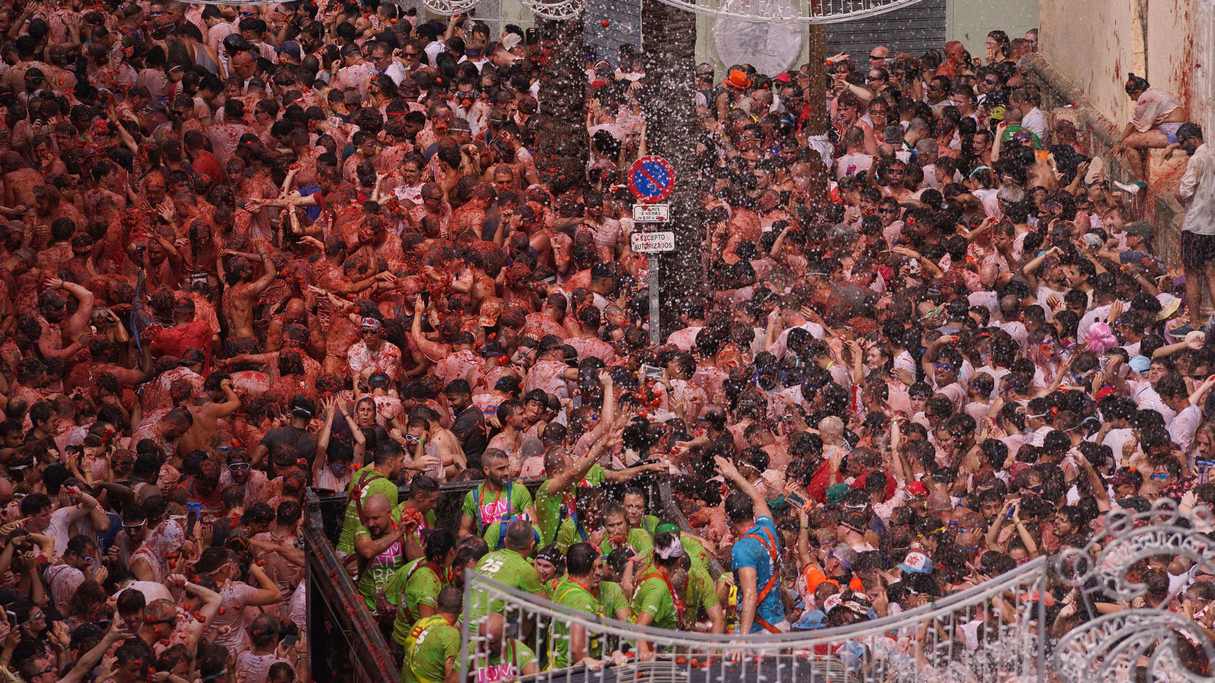 27/08/2025 00:09:57-Un any més, la localitat de Bunyol s'ha tenyit de roig, durant la celebració de la Tomatina. Milers de persones han participat de la festa, llançant-se 120 tones de tomates. Poc a poc, els treballs de neteja, van donant pas a la normalitat.