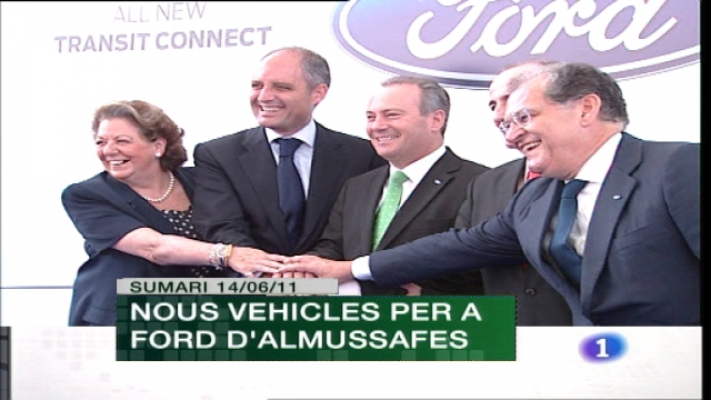 14/06/2011 00:24:46Ford anuncia que invertirà 800 milions d'euros a la planta d'Almussafes per la fabricació dels nous models del tot camí Kuga i del furgó comercial Transit / Les organitzacions de consumidors recomanen signar contractes per als campaments d'estiu dels xiquets / El Palau de les Arts de València ha trasmes per a 57 ciutat europees, la producció valenciana de l'òpera Tosca, de Puccini / ESPORTS: El Granada ha obert una taquilla a l'Estadi elxà, Martínez Valero, per posar a la venda 700 entrades per al partit de demà.