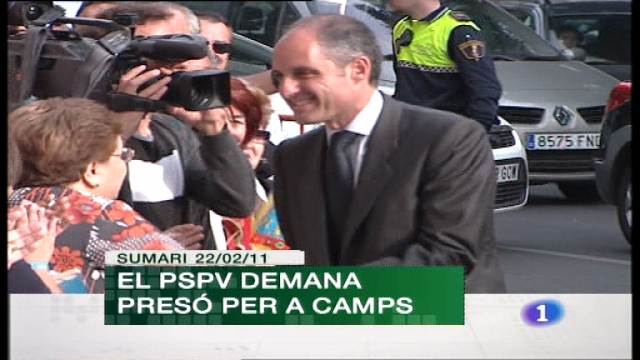 22/02/2011 00:25:56Els socialistes valencians, personats com acusació particular en el cas Gúrtel, demanen 3 anys de presó i 8 anys d'inhabilitació per al president Francisco Camps./El Port de València es consolida com motor de l'activitat econòmica de la Comunitat i com part de la solució a la crisi./El Festival València Escena Oberta continúa ocupant els carrers de la capital amb diverses propostes escèniques./El Villarreal, després d'encadenar tres partits sense guanyar en lliga, prepara el duel de tornada dels setezens de final de l'Europa League.