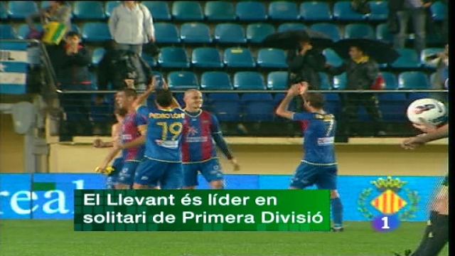 El Llevant no baixa el pistó i ja és el líder de Primera. Els granotes s'imposaren amb contundència al Vila-real a l'estadi del Madrigal./ El regidor d'urbanisme de l'Ajuntament de València Jorge Bellver i 4 tècnics municipals han segut absolts d'un delicte de prevaricació per autoritzar la construcció d'un aparcament en una zona protegida, junt als jardins de Monfort./ El pianista i creador britànic Michael Nyman ha oferit este cap de setmana un concert a l'auditori del Palau de Congressos de València centrat en la música de piano i de cinema./ Conclou a València el festival Cabanyal Íntim. 11 micro espectacles en cases del barri que conten xicotetes històries sobre el barri i els seus habitants.