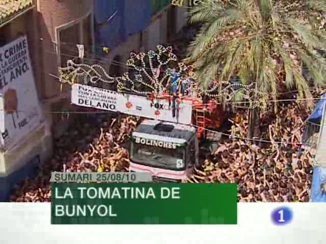 25/08/2010 00:15:42Més de 50.000 persones procedents de tots els racons del món, han participat hui en la tomatina de Bunyol, una cita festiva que tenyeix de roig el calendari estival. / La Biblioteca Valenciana publica els facsímils de les edicions més antigues del poeta més universal que han donat les nostres lletres. / El Vila-real ja es troba a Bielorrúsia, on demà jugarà el tràmit de la tornada de la prèvia de la Champions front el Dnepr.