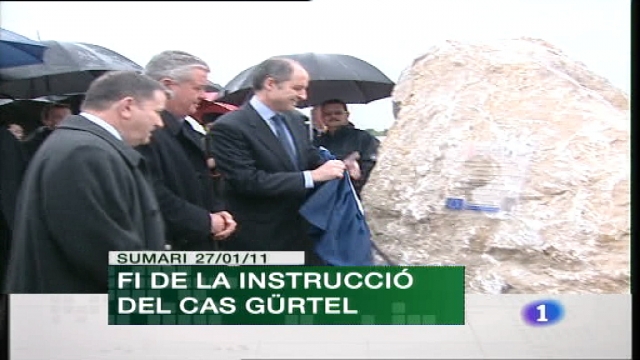 27/01/2011 00:25:21El jutge del Tribunal Superior de Justícia, instructor del cas dels tratges de Camps, ha conclòs les diligències i ara donarà trasllat a les parts. És el pas previ a que el magistrat decideixca si obri juí o arxiva la causa. Camps demana a la fiscalia que aplique la mateixa doctrina que amb els socialistes Bono o Chaves. / L'interior de Castelló està en alerta taronja davant el risc que s'acumulen 10 centímetres de neu. També n'hi ha avisos de pluges intenses i temporal marítim a qüasi tota la comunitat. / Este divendres s'estrena "Mil Cretins", coproduïda per Televisió Espanyola i obra del realitzador Ventura Pons. / ESPORTS El València ja ha fitxat el seu reforç d'hiver, Jonás Gonçalves. Després de passar el reconeiximent mèdic, el màxim golejador del campionat brasiler ja és jugador del club de Mestalla.
