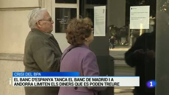 És l'oficina a Barcelona del Banc de Madrid, la filial espanyola de la Banca Privada d'Andorra, tancada després que aquest matí el Banc d'Espanya hagi decidit presentar concurs de creditors. El problema es la gran quantitat de diners que han retirat els clients des que els Estats Units van denunciar la connivència d'alguns directius amb el crim organitzat. A Andorra s'ha decidit limitar a 2.500 euros setmanals els que es poden treure.