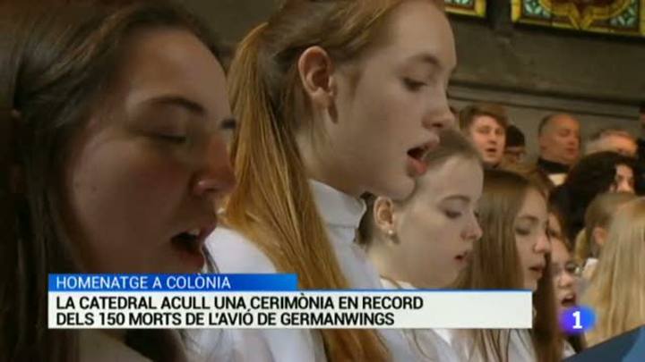 Situem també a la portada de L'Informatiu el primer funeral d'estat per les víctimes de l'avió de Germanwings. L'han fet a la catedral de Colònia i han assistit el ministre de l'Interior, Jorge Fernández Díaz, i la vicepresidenta catalana, Joana Ortega. El proper homenatge serà el funeral d'estat que es farà a Barcelona el dilluns 27 d'abril.
