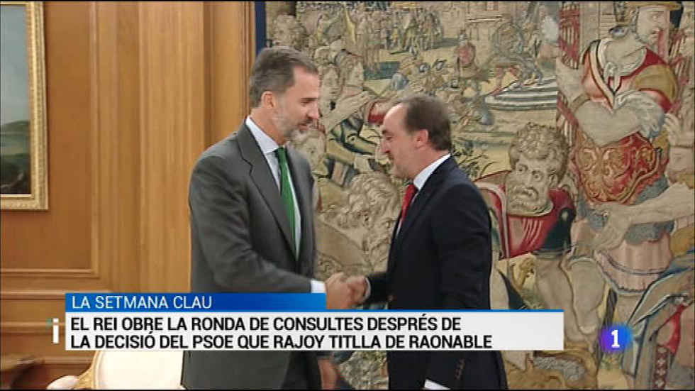 24/10/2016 00:25:48El rei ha obert aquest matí la ronda de contactes amb els líders del partits al Congrés que acabarà demà amb la presentació de la candidatura de Mariano Rajoy a la investidura. Tot fa pensar que Rajoy serà reelegit president del govern el cap de setmana. Tot plegat després de la decisió d'abstenir-se del Comitè Federal del PSOE. Una decisió que Rajoy ha dit ha titllat de raonable. A més, s'ha mostrat disposat a negociar.