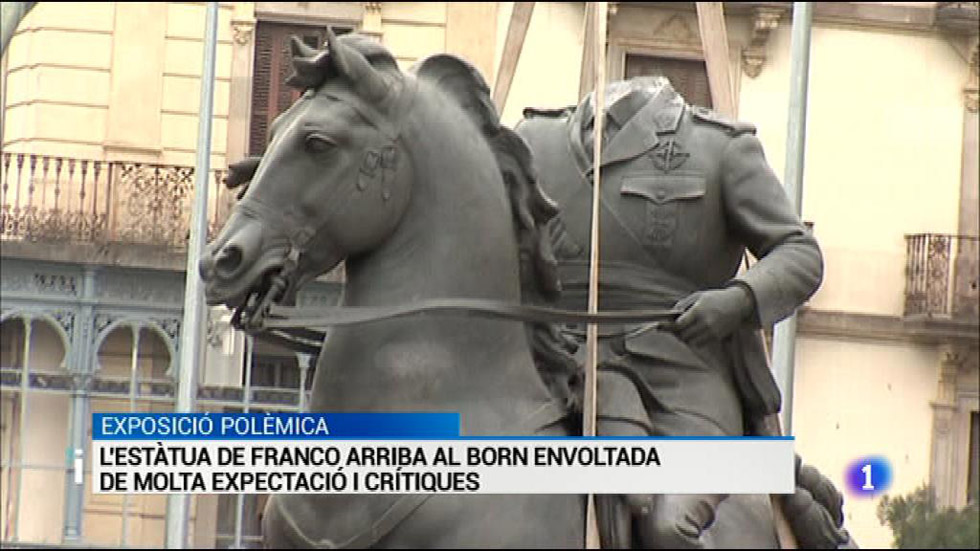 17/10/2016 00:26:51L'estàtua eqüestre decapitada de Franco que forma part de la polèmica exposició de l'ajuntament de Barcelona ja és al Born i ho ha fet carregada d'expectació i de polèmica. Tant que fins i tot ja li han llençat algun ou. Aquest matí els operaris l'han col·locat a les portes del centre cultural al costat d'escultures de la república i la transició democràtica. El consistori defensa la mostra davant les crítiques que ha rebut dels partits de l'oposició.