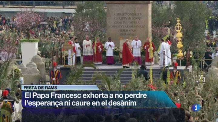 24/03/2013 00:25:17El papa Francesc exhorta a l'acte litúrgic a la plaça de Sant pere, en aquest diumenge de rams, a no deixar-se vèncer pel desànim i no deixar-se robar l'esperança. La celebració de rams s'ha viscut com una festa rreu de catalunya on s'ha renovat un any més la tradició de beneir palmes i palmons.