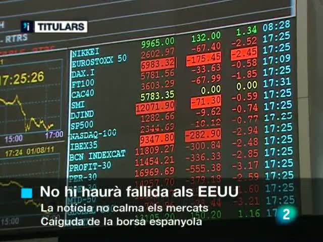 01/08/2011 00:16:37Els mercats mundials han tancat avui a la baixa malgrat l'anunci del president Obama d'un acord in extremis per evitar que els EEUU es declarin en fallida. La borsa espanyola ha caigut de més de 3 punts i la prima de risc ha fet un altre record històric./El PSC ajorna fins al desembre el congrés on s'havia d'escollir el nou primer secretari dels socialistes catalans. No serà fins després de les eleccions que es decidirà qui substituirà José Montilla i com es reformula un partit que ha sofert una forta devallada electoral./Transit ha finalitzat avui la instal·lació de 10 nous radars per controlar la velocitat a les carreteres catalanes. /Bimbo ha pactat amb els seus treballadors un ERO per les 600 persones de l'àrea comercial. El pacte preveu que 360 contractats indefinits passin a ser autònoms dependents./Conductors d'ambulància que, al matí, protestaven a l'Aeroport del Prat i aconsellen els turistes que no es posin malalts durant les seves vacances per les retallades a la Sanitat./Sergio Guzmán Gutierrez, l'home detingut per la Policia Nacional de Tarragona acusat d'exercir de dentista sense tenir la titulació oficial i d'usurpar els números de col·legiats d'altres professionals./Sancions d'entre 3 mil i 10 mil euros. És el que poden arribar a pagar els empresaris que no donin d'alta el seus treballadors a la Seguretat Social. Multes 5 cops superiors a les que havien de pagar fins ara. /Les tres turistes catalanes que han resultat ferides en un accident d'autobús a Cambodja estan fora de perill. ./Els oftalmòlegs recorden que també cal cuidar els ulls, que pateixen amb les substàncies irritants de les piscines./Milions de musulmans de tot el món comencen avui el Ramadà./Ja amb Adriano Correia, el Barça ha fet cap a Miami, segona aturada de la seva gira americana. Però per un ha estat l'última. És el cas de l'extrem Jeffren que ha marxat tot just acabat l'entrenament. La raó: és a un pas de fitxar per l'Sporting de Lisboa./els dos equips de la lliga Asobal han començat avui la pretemporada. El Fraikin Granollers ho ha fet aquesta tarda i el Barça-Interesport, aquest matí./Els museus obren per vacances amb més propostes més arriscades