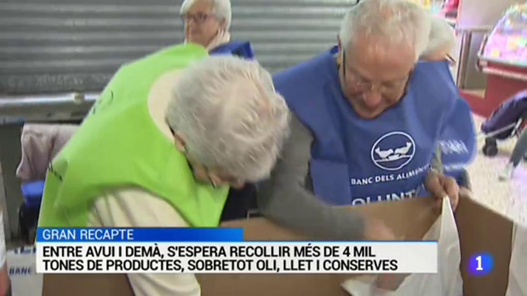 Comença el Gran Recapte. Entre avui i demà, s'espera recollir més de 4.300 tones d'aliments, sobretot oli, llet i conserves als 2.700 punts de recollida establerts per tot Catalunya. Productes que permetran abastir les persones que pateixen pobresa cronificada durant els propers tres mesos.