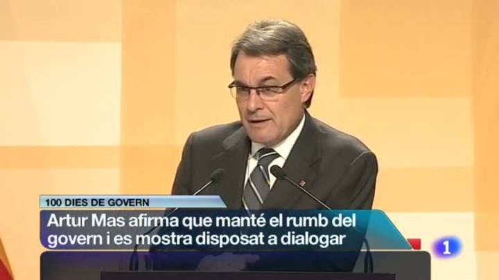 Fa gairebé dues hores que el president de la Generalitat està donant comptes del seus primers 100 dies de govern i també ha donat pistes del camí per on anirà a partir d'ara./Mariano Rajoy ha dit avui que mantindrà el diàleg amb totes les comunitats autònomes per resoldre els seus problemes de finançament i sense anomenar explícitament Catalunya, ha advertit que el que no farà és parlar d'allò que surti de la legalitat./Ramon Jáuregui, coordinador de la conferència política del PSOE, diu que per solucionar els problemes de Catalunya cal diàleg./I com us deiem. El jutge José Castro ha imputat la infanta Cristina pel cas Noos./I novetats en el cas Palau de la Música: El jutge confirma la fiança a CDC./La segona setmana del Saloufest, la trobada en principi esportiva, de joves britànics a la costa daurada, deixa un jove de 21 anys ferit greu i que està ingressat a l'Hospital Joan 23 de Tarragona./ En una operació conjunta,mossos i policia nacional han desmantellat una de les organitzacions més importants que en els darrers mesos hauria introduit a Catalunya més de tres tones de h'aixix provinent del Marroc./Un porc senglar passejava per aquest carrer del centre de Barcelona, molt a prop de l'estació de Sants./7 hospitals catalans concertats, és a dir que es financien majoritàriament amb fons públics, cobren als acompanyants dels pacients per utlitzar butaques que es converteixen en llit. Han de pagar 5 euros cada vegada./Bones notícies per a Leo Messi i per al Barça./Tot plegat una bona una factura per un empat a dos.... El PSG es va confirmar com un rival perillós, que aspirarà a TOT dimecres vinent al Camp Nou./I a la segona jornada dels quarts de final, dos equips espanyols: el Madrid rep el Galatasaray, amb Casillas a la grada, i el Màlaga al Borussia de Dortmund./Les semifinals de la Copa Catalunya es jugaran el 16 ó 17 d'abril a Tarragona. El Barça s'enfrontarà al Nàstic i l'Espanyol al Llagostera./Els jugadors de básquet del Força Lleida amenacen de no viatjar a Ourense per jugar aquest divendres si el club no els paga deutes pendents