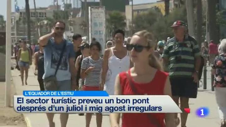 14/08/2014 00:26:12A punt de començar el pont del quinze d'agost, que marca l'equador de les vacances d'estiu, el sector turístic espera que els pugi la feina aquests dies...La temporada ha estat irregular, i hi ha hagut zones on el mal temps ha afectat l'ocupació. A Barcelona ciutat els hotels preveuen superar les previsions aquests dies, pels volts del noranta per cent. A l'interior, el turisme rural preveu una ocupació a l'agost del 80%, després d'un juliol més fluixDes de mitjans de juliol que el sector turístic està pendent del cel... La temporada d'estiu fins ara ha estat més fluixa del què s'esperava sobretot a la costa i en bona part perquè el temps no ha acompanyat massa./ Més optimista és el sector del turisme rural, que té plena ocupació aquests dies i una previsió del 80 per cent el conjunt de l'agost./ Més de la meitat del milió 580 mil turistes russos que van visitar Espanya durant el 2013 van estar-se a Catalunya./ A partir d'aquesta tarda s'espera que el volum de trànsit augmenti a les carreteres justament en motiu del pont...De fet és un dels caps de setmana de l'estiu amb més moviment a les carreteres./ I a partir de les 10 d'aquesta nit, l'estació de Catalunya de Barcelona dels Ferrocarrils de la Generalitat quedarà tancada durant tres dies, fins dillunsAvui encara cueja la polèmica sobre què s'ha de fer si Artur Mas convoca la consulta el 9 de novembre i el Tribunal Constitucional la suspèn...El partit popular acusa Mas de frustar i causar confrontació, i la vicepresidenta Ortega insisteix que el camí està marcat. L'impacte del boicot de Rússia als productes alimentaris de la Unió europea es discuteix avui en una reunió a Brussel·les./ El boicot rus sembla que de moment encara no es nota en els preus de la fruita dolça a Mercabarna./ Encara que pugui semblar contradictori, la crisi ha ajudat a què alguns negocis creixin.. És el cas de les pàgines web que venen objectes de segona mà...Algunes, en sis anys, han multiplicat per DOS els usuaris./ Cop policial contra una banda de llauners que venia droga al barri Gòtic de Barcelona, sobretot als turistes. De moment hi ha tretze detinguts./ I ara veureu com han quedat els vehicles que transportaven un grup de turistes israelians a Sort./ Una trentena d'immigrants subsaharians han arribat BETA al Centre d'Internament d'estrangers de la Zona Franca, i avui se n'espera una trentena més. Provenen del sud de la península, on van arribar després de creuar la frontera des del MarrocD'aqui a pocs minuts coneixerem una de les notícies més esperades de l'estiu pels barcelonistes. Cap a a les tres de la tarda el TAS anunciarà la sanció definitiva per Luís Suarez./ Esperant poder incorporar ben aviat Suárez, Luis Enrique segueix treballant amb la plantilla preparant el Gamper i el debut a la Lliga contra l'Elx./ L'Espanyol ha posat fi al culebrot Thievy, que finalment marxa cedit a l'Almeria, i Cristian Gómez se'n va al Girona./ De la resta de l'actualitat futbolística, destaca el triomf de San Lorenzo a la Copa Libertadores, que li permet al club argentí trencar una malastrugança històrica./L'atleta de Lloret Àngel Mullera disputa aquest tarda, a tres quarts de nou, la final dels 3MIL obstacles del campionat d'europa de Zurich./ I a l'Europeu de Natació de Berlín, Ona Carbonell i Paula Klamburg s'han classificat per a la final de dúo lliure amb la tercera millor puntuació./ En tennis, Tommy Robredo s'enfrontarà avui al número 1 del món Novak Djokovic al Masters 1000 de Cincinnati. I anit a Peralada, hi va actuar tot un animal escènic...Rosario, que un any més va omplir d'energia i bones vibracions els festivals d'estiu catalans
