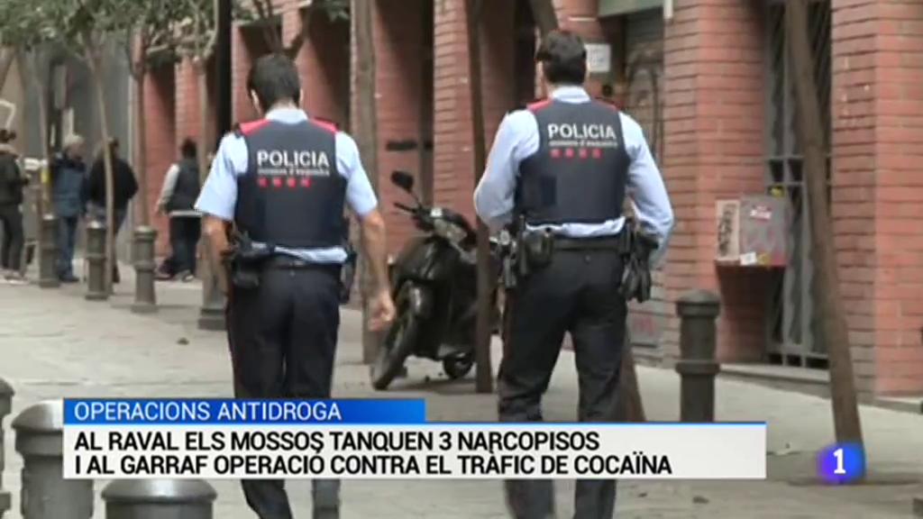 Dues operacions antidroga a Catalunya en les darreres hores. D'una banda, al Raval, on els mossos i la guàrdia urbana han tancat 3 narcopisos i han detingut 6 persones en una operació que ha començat de matinada. I al Garraf, els mossos han detingut 10 persones relacionades amb el tràfic de cocaïna i han escorcollat 17 habitatges.