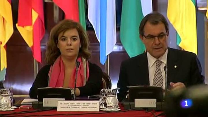 02/10/2012 00:08:06D'aquí a uns minuts és previst que acabi la Cinquena Conferencia de Presidents al Senat. Una trobada on s'entreveu la tensió entre el president de la Generalitat i l'executiu de Rajoy. Cares seriososes, converses tenses i gestos que evidencien el distanciament. Els dinou líders autonòmics, la majoria del PP, s'han trobat sobre la taula un document de tres pàgines amb la declaració que el govern vol que surti de la trobada, i que es basa en el compromís de compliment de l'objectiu del dèficit. L'1,5% per les autonomies i el 6,3% per l'Estat. El document no ha agradat a Artur MAs, que exigeix que l'Estat flexibilitzi el compliment de l'objectiu per les autonomies, donat que Brusel·les ho ha fet amb l'Estat.