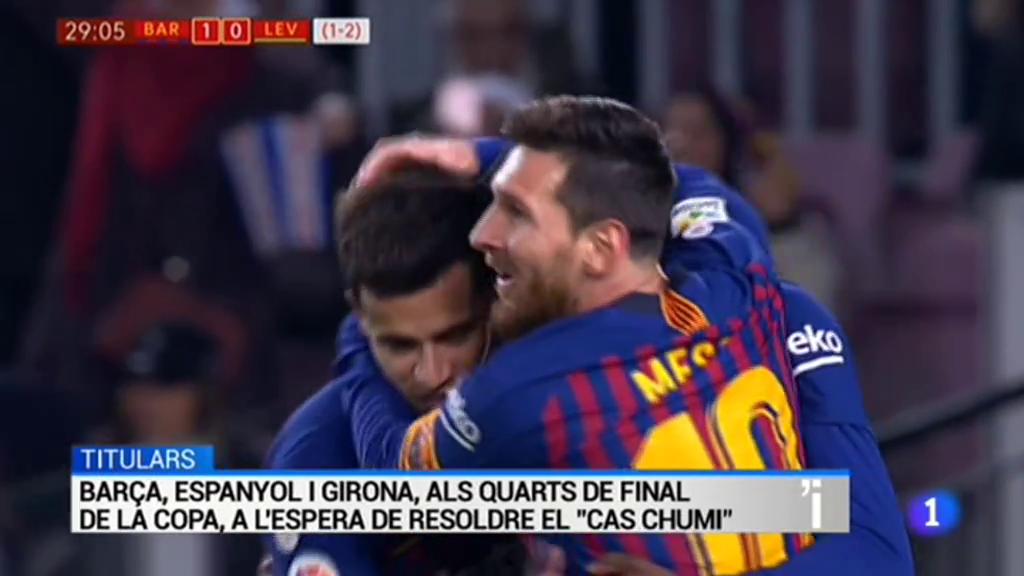 A hores d'ara el Barça està pendent de la decisió de les autoritats esportives sobre els cas Chumi, per una hipotètica alineació indeguda del jove central blaugrana a l'anada de la Copa contra el Llevant./ I el que van fer amb Messi al capdavant va ser....superar clarament al Llevant, per 3 gols a zero./ Al bombo de quarts també hi seran el Girona ...i l'Espanyol, que ahir es va desfer del Vila-real amb un contundnet resultta de 3 a 1.
