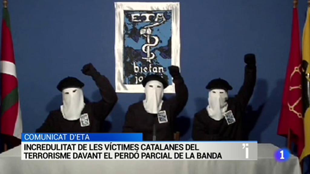 Incredulitat de l'Associació Catalana de Víctimes del Terrorisme al comunicat de la banda terrorista ETA en la que demana perdó a part de les seves víctimes i admet el mal fet. Un document que arribaria com a pas previ a la seva dissolució definitiva que podria arribar el mes vinent. El govern ho considera una conseqüència de la fortalesa de la democràcia i l'estat de dret.