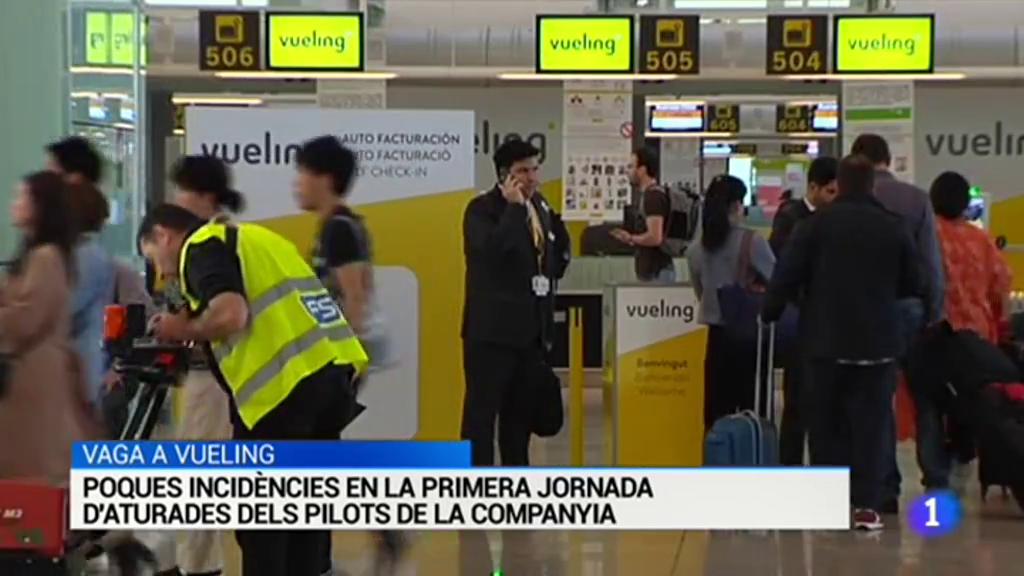 Poques incidències en la primera jornada de vaga dels pilots de Vueling que ha obligat a cancel·lar 240 vols entre avui i demà. La majoria de passatgers han estat avisats i reubicats. El sindicat SEPLA demana millores laborals pels pilots d'aquesta companyia. La setmana vinent hi haurà dos dies més d'aturades.