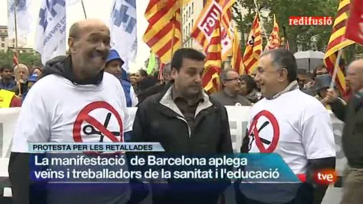 28/04/2013 00:24:50Milers de persones han sortit als carrers de Barcelona, desafiant el dia de pluja, per protestar contra les retallades als serveis socials a Catalunya. La manifestació ha aplegat asociacions de veïns, i treballadors de la sanitat , l'educació i la Funció Pública.