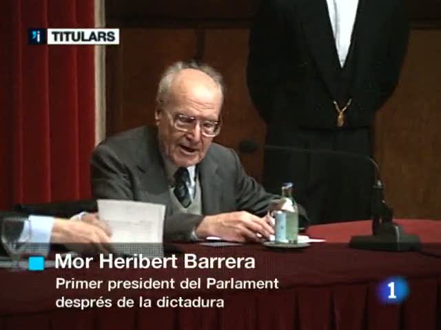 28/08/2011 00:24:41Mor als 94 anys l'ex-president del Parlament Heribert Barrera. Els líders polítics catalans coincideixen en destacar el seu paper en la lluita per la llibertat i l'autogovern de Catalunya. La capella ardent s'instal·larà demà al Parlament.