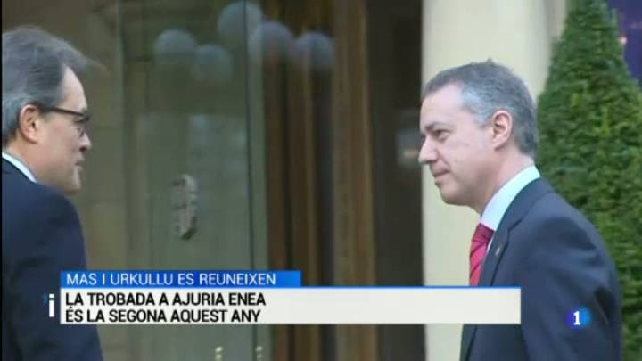 28/12/2014 00:26:59Trobada entre Artur Mas i Íñigo Urkullu al Palau d'AjuriaEnea, a Vitòria. Tots dos presidents assistiran aquesta nit al partit de futbol entre les seleccions de Catalunya i Euskadi. És la segona vegada que es troben aquest any, l'anterior va ser al maig, també a Vitòria. Sens dubte durant la trobada hauran parlat del procés sobiranista català, al que avui s'afegeix un article d'Oriol Junqueras, que insta el president a deixar de banda el debat i buscar el consens per obtenir un ampli suport. Desde CDC destaquen que hi ha aproximacions importants amb ERC.