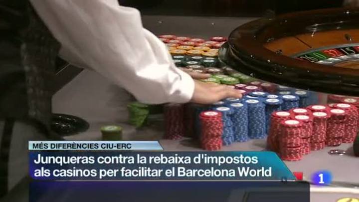 17/06/2013 00:24:22Noves esquerdes a l'acord entre Convergència i Unió i Esquerra Republicana. Aquesta vegada per la decisió del govern de rebaixar els impostos als casinos i facilitar la instal·lació del complex Barcelona World. Oriol Junqueras diu que el seu partit no hi donarà suport, és més, si per ell fos ha dit que prohibiria el joc. El soci de Mas també ha dit que no veu motius per retardar la celebració d'una consulta.