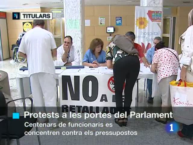 31/05/2011 00:25:17El pressupostos per l'any que ve ja són al Parlament: la Generalitat gastarà uns 2700 milions menys que el 2010./ Concentració a les portes del Parlament: 500 treballadors públics de la Generalitat, sobretot de la sanitat i l'ensenyament, s'han manifestat en contra aquests pressupostos./ També protestes a les portes dels hospitals d'arreu de Catalunya./ Alerta alimentària: ja són 16 els morts per la bactèria E-coli a Europa. A Sant Sebastià s'hauria localitzat el primer cas d'un pacient espanyol infectat pel bacteri del cogombre./ Dia Mundial sense Fum: el 2011 es diagnosticaran més de 5000 càncers de pulmó. 600mil fumadors passius i més de 5 milions de fumadors moriran enguany a causa del tabac./ El futur de l'acampada dels indignats de Plaça Catalunya, a Barcelona, es decideix en l'assemblea d'aquesta nit./ El Consell Escolar de Catalunya debatrà el calendari que proposa el departament d'Ensenyament, que implica començar les classes el 7 de setembre. Ara bé, pares i mestres prefereixen el dia 12./ La Guardia Civil ha desarticulat una organització criminal dedicada a la introducció i distribucióde cocaïna i haixix a Europa./ Els Mossos d'Esquadra i la Policia Nacional han desarticulat una banda internacional de xilens que es dedicaven al robatori de pisos per tota Espanya./ Els Mossos d'Esquadra investiguen la desaparició d'una noia de 16 anys a Girona, Laura Paunero, que va sortir per veure la final dela Champions ... La policia també està buscant una altra noia, Jessica Macarena Jiménez, de 16 anys, que va marxar de casa seva, a Cassà de la Selva, després d'una discussió amb la seva mare./ Jacques Leonard és un francés que a la Barcelona dels 50 queda prendat de Rosario Amaya./ Selecció reconciliadora? Els internacionals de Barça i Madrid es retroben desprès de la polèmica