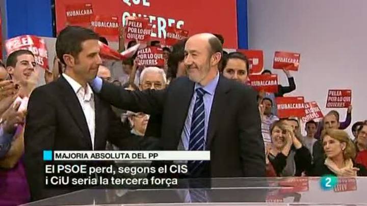 04/11/2011 00:25:39Rajoy aconseguiria una majoria absoluta superior a la d'Aznar al 2000. Ho diu el Centre d'Investigacions Sociològiques. Segons el darrer pronòstic, el PSOE obtindria el pitjor resultat de la seva història, amb una forquilla d'entre 116 a 121 escons. El PP, amb més de 190 diputats, tindria la seva millor nota. De la mostra destaca que CiU revalidaria la tercera posició al Congrés. A Catalunya, els socialistes guanyarien les eleccions, CiU i Iniciativa pujarien, mentre que Esquerra mantindria els 3 escons.