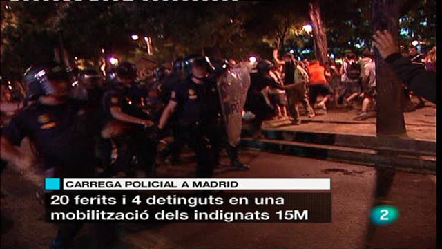 05/08/2011 00:17:36La tempesta financera que no s'atura obliga Brusseles a assegurar que Espanya i Itàlia no necessiten cap rescat. Duran i Lleida s'uneix a la tesi del PP que Zapatero NO afronta la situació i demana que les eleccions encara s'anticipin més./Despres de la càrrega policial d'ahir a Madrid que va causar una vintena de ferits, el moviment del 15 M ha convocat una marxa aquest vespre a la capital d'Espanya. A Barcelona els indignats fan una assamblea per solidaritzar-se amb els companys de Madrid./Un estudi médic conclou que desplaçar-se en bicicleta redueix les posibilitats de patir càncer i malalties cardiovasculars. El treball calcula que a Barcelona el bicing salva 12 vides l'any./L'Arsenal rebutja l'última oferta del Barça pel fitxatge de Cesc Fàbregas. El català però, no ha viatjat amb els "gunners" per jugar un amistós contra el Benfica portugués; i Barça i Arsenal es reuneixen aquesta tarda a Londres per acostar posicions.