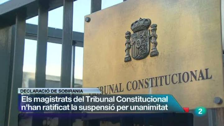 11/07/2013 00:29:23La declaració de sobirania aprovada pel Parlament el 23 de gener continua suspesa de manera cautelar pel Tribunal Constitucional. Els 12 magistrats ho han decidit per unanimitat en resposta al recurs del Parlament de Catalunya. CiU, Esquerra, Inciativa i la CUP s'han afanyat a criticar la decisió assegurant que el Constitucional està polititzat. El PP i Ciutadans la considerebn una decisió coherent.