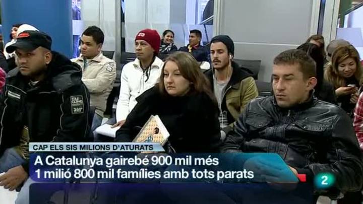 24/01/2013 00:29:36Les xifres de l'atur fan por. A Espanya ja hi ha gairebé 6 milions de persones que volen treballar i no poden. I, a Catalunya, els aturats són prop de 900.000. Són les últimes dades de l'Enquesta de Població Activa de la que també es desprén que 1.800.000 famílies tenen tots els seus membres a l'atur. I Catalunya ha estat la comunitat on més ha crescut l'atur els últims mesos. Davant aquestes xifres, les més altes de la Història, el president Rajoy ha anunciat, fa molt poca estona, una pròrroga del pla PREPARA, que dóna prestacions de fins a 450 euros a persones aturades sense cap altre ingrés./El govern de la Generalitat i ERC ja preparen el camí cap a la consulta sobiranista. El govern de Madrid diu que farà cumplir la llei i el PP de Catalunya estudia si la via judicial pot aturar aquests plans./Els diputats socialistes que ahir van trencar la disciplina de vot neguen que vulguin fracturar el PSC. Les discrepàncies, però, continuen i, avui, a la Diputació de Lleida, el PSC no ha volgut oposar-se a la declaració aprovada al Parlament./La Junta de Seguretat de Platja d'Aro acorda instal·lar càmeres de seguretat al municipi i a les urbanitzacions. Ramon Espadaler diu que eleven al nivell màxim l'alerta al Baix Empordà, on destinaran més efectius policials./El Barça es juga, a partir de les 10 de la nit a La Rosaleda, el seu futur a la Copa del Rei. Els blaugrana han de remuntar el 2 a 2 de l'anada i Jordi Roura aliniarà l'equip de gala. Si passen a semifinals, els espera un Reial Madrid que avui ha viscut una nova crisi institucional.