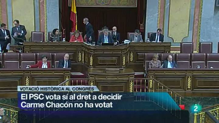 26/02/2013 00:29:39Finalment s'ha confirmat: 13 dels 14 diputats del PSC al Congrés han trencat la disciplina de vot del PSOE i han votat a favor de la proposta de resolució de CiU sobre el dret a decidir de Catalunya. Carme Chacón NO ha participat en aquesta votació. Aquesta és la primera vegada que els socialistes catalans voten de manera diferent al PSOE. Un fet que tindrà conseqüències: sancions per a aquests 13 diputats. I, a llarg plaç, ha dit Rubalcaba, caldrà revisar les relacions entre el PSOE i el PSC.