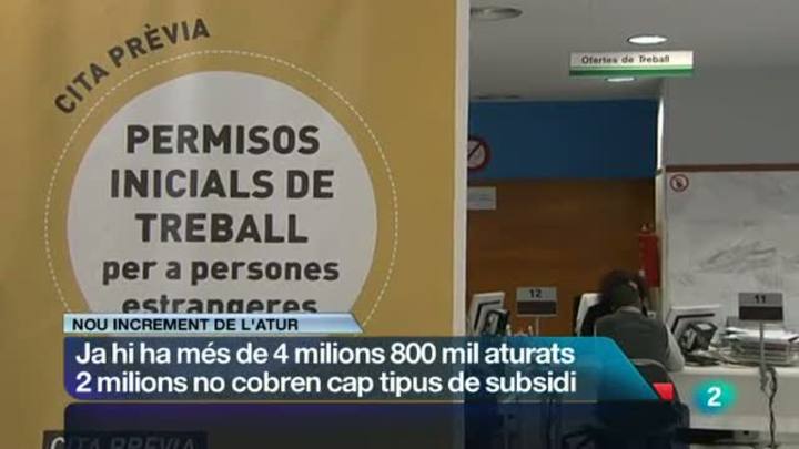 05/11/2012 00:27:40Els aturats oficials, és a dir els que figuren registrats a les oficines d'ocupació, superen ja la xifra de 4 milions 800 mil. L'enquesta de població activa, però, que recull tots els aturats, parlava fa uns dies de més de 5 milions 770 mil parats. Xifres realment escruixidores, sobretot si tenim en compte que hi ha 2 milions d'aquests aturats ja no cobren cap subsidi.
