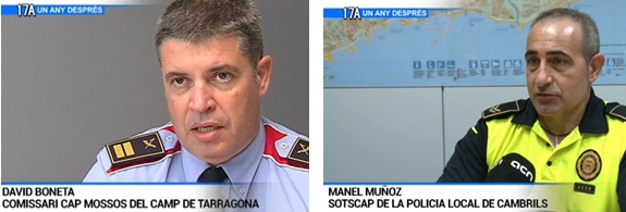 13/08/2018 00:02:06El comissari cap dels Mossos del Camp de Tarragona, David Boneta, i el sots cap de la policia local de Cambrils, Manel Muñoz, no obliden el relat d'aquella matinada. Un Audi, ocupat per 5 persones, es va saltar un control policial a l'entrada de Cambrils. Va recórrer uns fatídics 2 kilòmetres i mig fins arribar davant del club Nàutic on el cotxe va bolcar i els Mossos van abatre els terroristes.