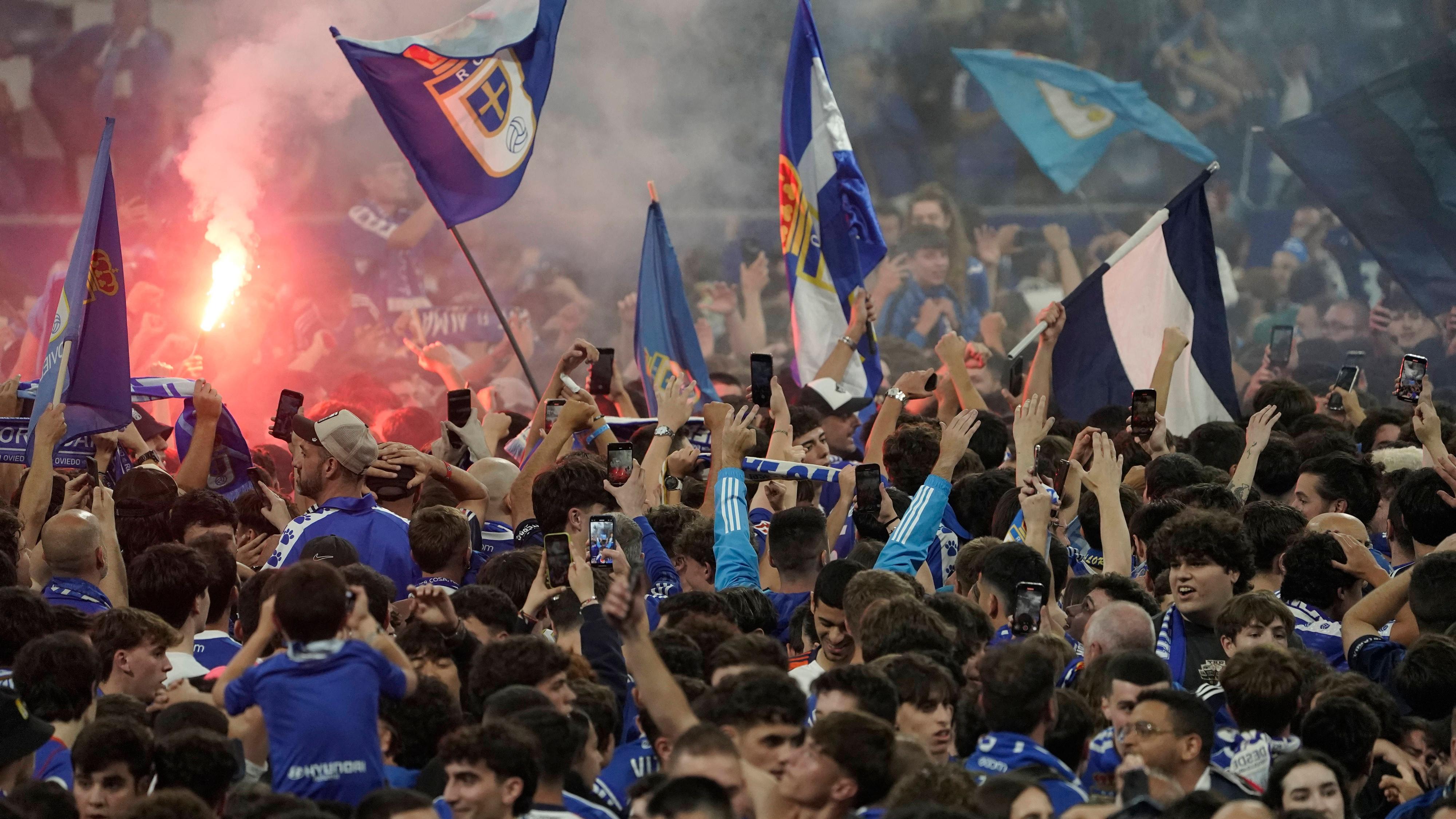 La afición del Real Oviedo celebra sobre el césped del Tartiere el ascenso de su equipo a Primera División