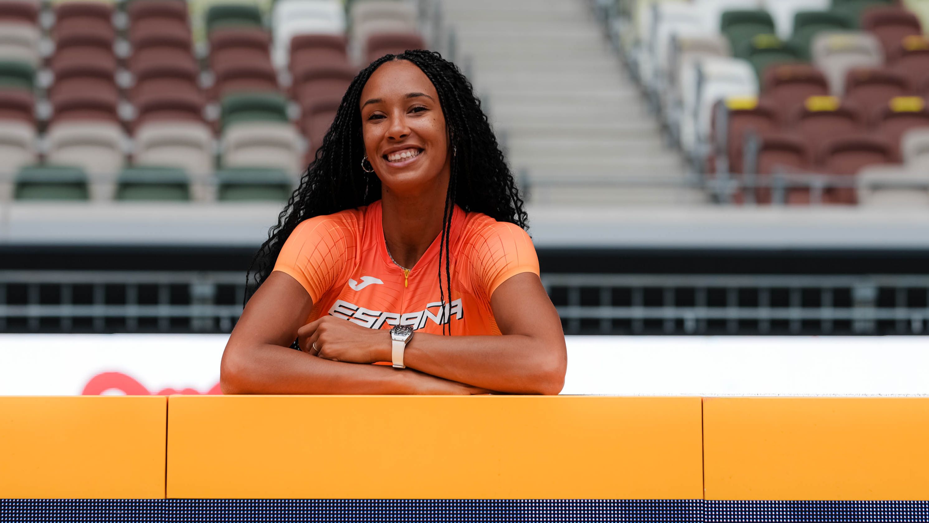 La heptatleta española María Vicente posa para una fotografía este viernes en el Estadio Nacional de Tokio antes del Campeonato del Mundo de Atletismo