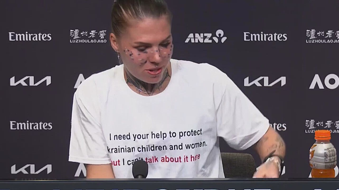 La imagen del día en el Open de Australia es la de la tenista ucraniana Oleksandra Oliynykova en rueda de prensa tras ser eliminada con una camiseta que dice: "Necesito tu ayuda para proteger a los niños y mujeres de Ucrania, pero no puedo hablar aquí de eso".