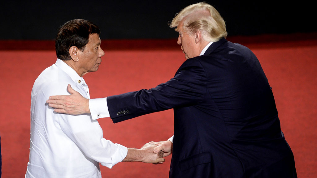 El presidente de Filipinas, Rodrigo Duterte, se arranca a cantar una canción de amor en la cumbre de la Asean, bajo "las órdenes" del comandante en jefe de EE.UU. Donald Trump ha sido recibido con manifestaciones en contra en las calles de Manila. El mandatario filipino ha comprado armas a Rusia y China pero ya no habla de desmantelar las cinco bases militares estadounidenses en suelo filipino. Además tropas especiales norteamericanas han combatido junto las Fuerzas Armadas filipinas en contra del Estado Islámico en Marawi.