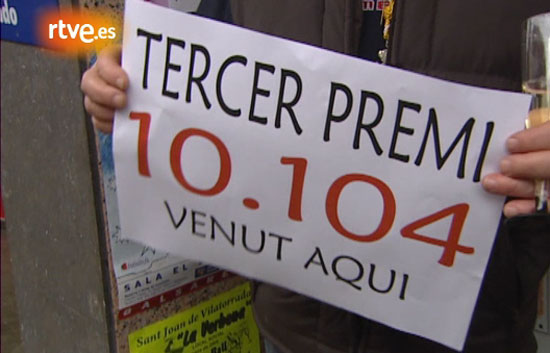 El Tercer Premio de la Lotería de Navidad, el 10.104, ha dejado quince millones de euros en la localidad de Sant Joan de Vilatorrada (Barcelona), cuya única administración ha repartido los décimos en un colegio, un club deportivo y por ventanilla.